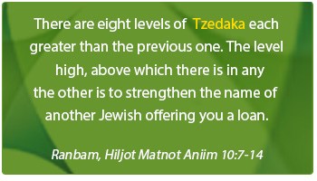 The highest level of Tzedaka requires helping someone to rely on his own resources, before he requires assistance or becomes empoverished. This is attained by granting him genuine help in a dignified way, by means of an adequate loan, or help him to obtain employment or set up a business, and therefore not having to rely on outside help.
